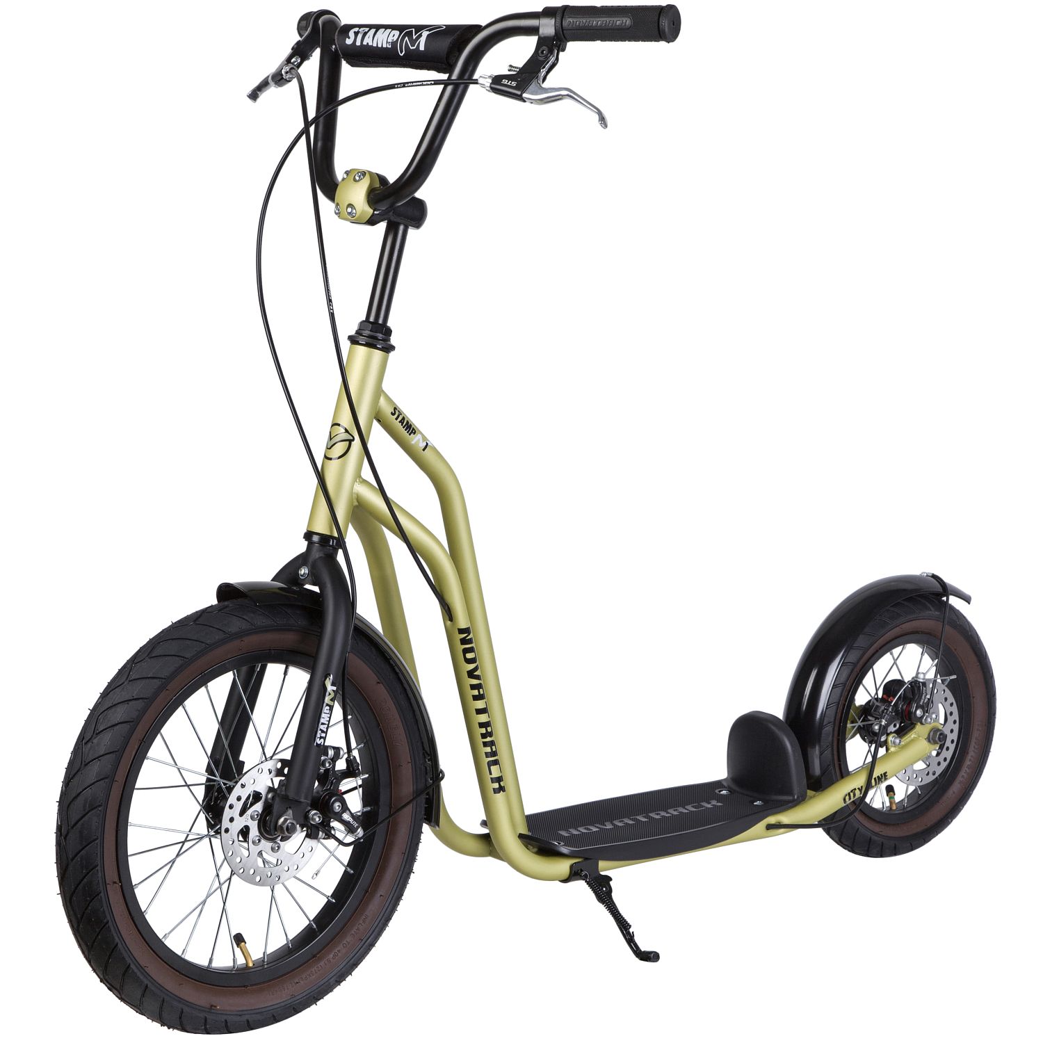 Novatrack Stamp Disc - внедорожный самокат отлично подойдет для любителей погонять, как по городу, так и по пересеченной местности. Увеличенный диаметр переднего колеса позволит вам без труда преодолевать бордюры и небольшие ямы. Модель оборудована дисковыми тормозами, которые сделают ваше торможение быстрым и плавным. На самокат возможна установка крыльев, которые защитят Вас от грязи и мелких камней. Надувные колеса имеют ряд ощутимых преимуществ. Они бесшумны, с мягкими колёсами поездка будет мягче и комфортнее. Хорошо защищают от неровностей благодаря амортизирующим свойствам. Такие колёса комфортны при езде по неровным дорогам. В дождливую погоду надувные колеса увереннее держатся в поворотах. Они отлично тормозят и не скользят на разных поверхностях. Благодаря отличному сцеплению, помогают развивать более высокую скорость.