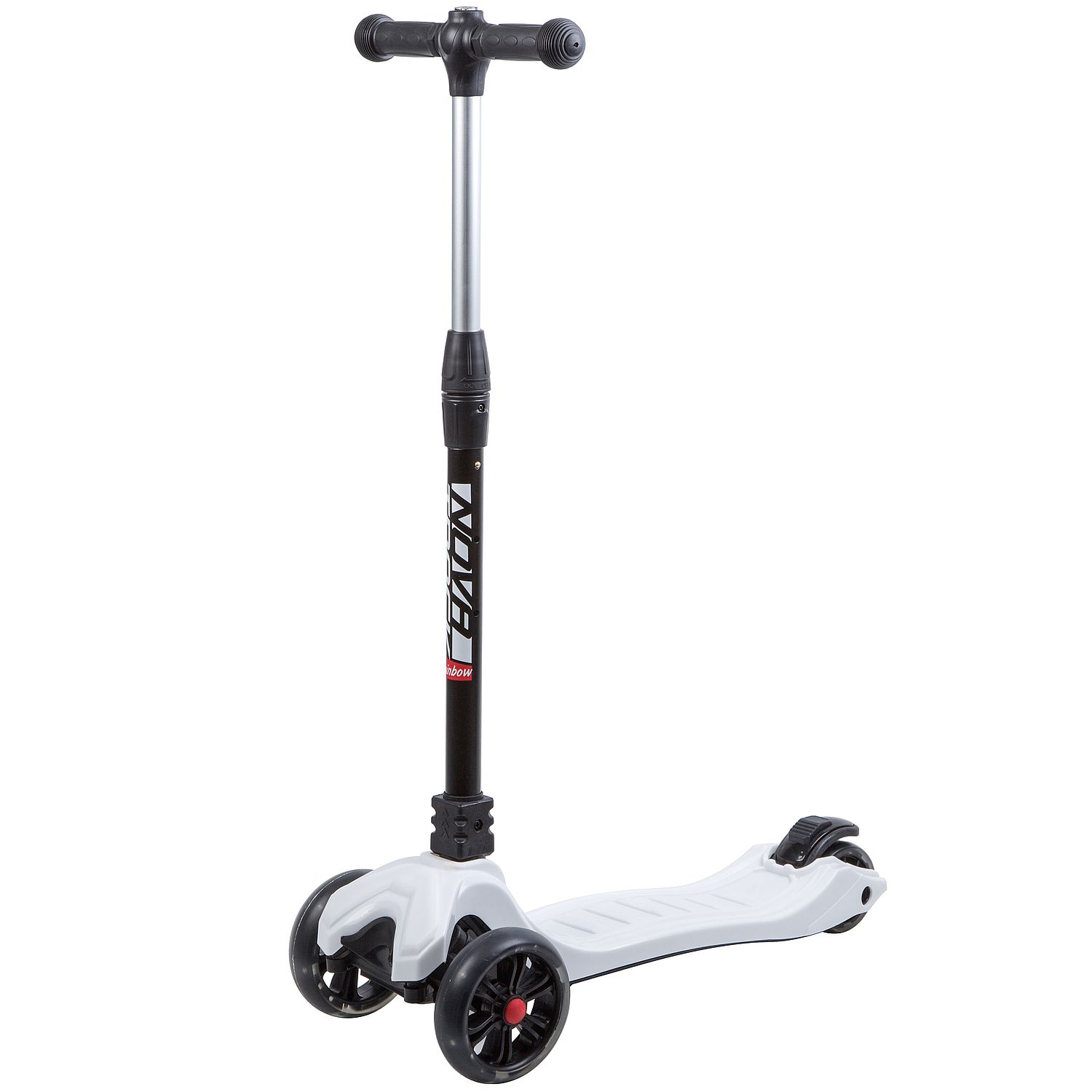 Novatrack RainBow 120W-1 детский трёхколесный самокат-кикборд, предназначенный для детей от 3 лет. Cветящиеся при движении колеса обязательно обрадуют вашего ребенка и сделают его более заметным в темное время суток. Имеется регулировка руля по высоте в трёх положениях. Модель оснащена механизмом с надежным замком, благодаря чему компактно складывается для транспортировки или хранения. Самокат выдерживает до 50 кг.