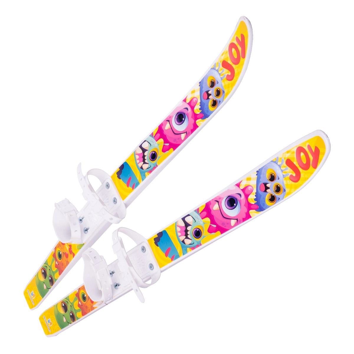 Комплект оснащён удобными пластиковыми креплениями, которые подходят для повседневной обуви. Глубокие пластиковые ремешки надёжно фиксируют ногу, обеспечивая безопасность и комфорт во время катания. Алюминиевые лыжные палки с пластиковыми травмобезопасными наконечниками снижают риск травм, что особенно важно для маленьких лыжников.