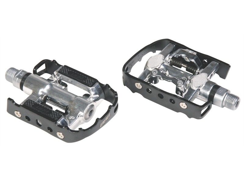 Двухфункциональные педали с SPD-механизмом крепления и с противоскользящими шипами для уличной обуви.
