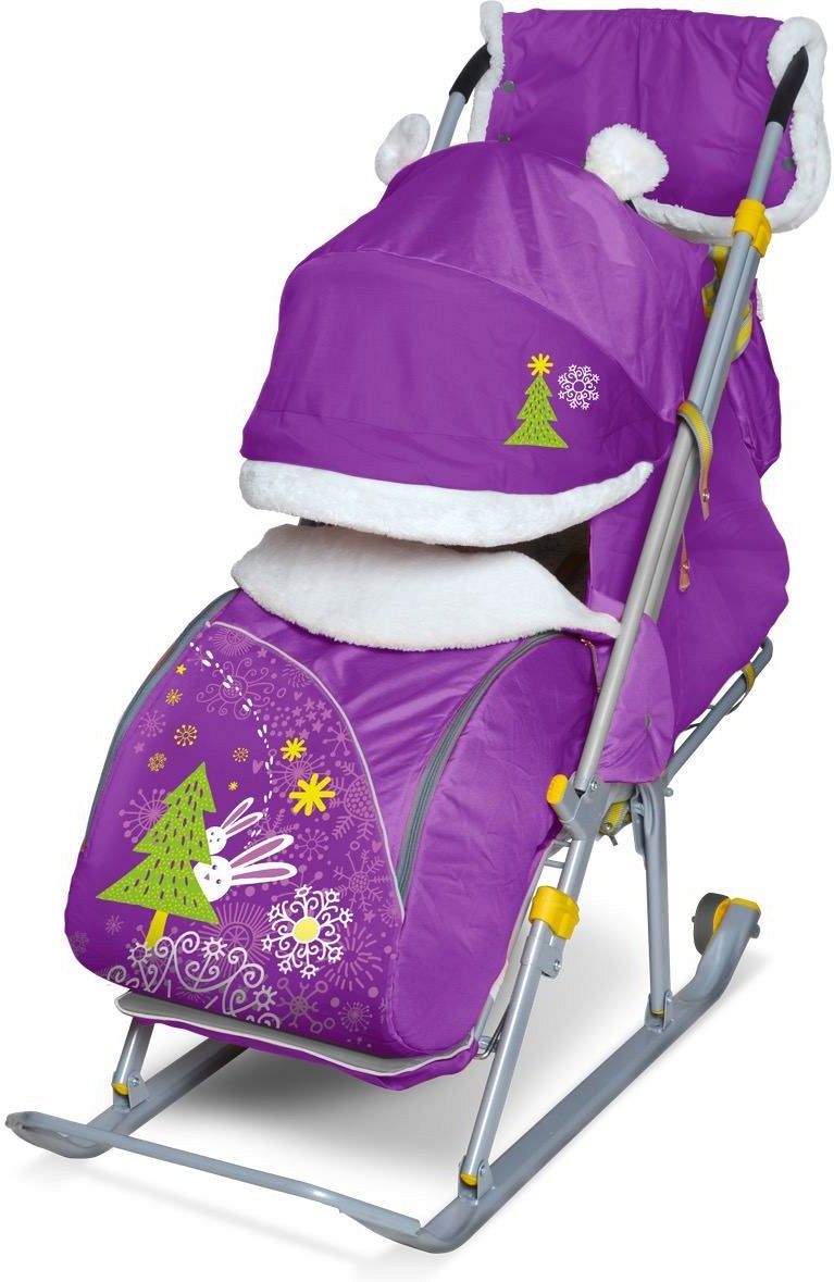 Детские санки в зимнем дизайне, которые сделаны так, чтобы быть удобными и комфортными для малышей. На санках есть меховая отделка на крыше, чехол для ножек и ушки. Также есть меховая муфта на ручке санок для мамы. Рисунки на санках яркие и зимние. Санки имеют высокий козырек и широкое посадочное место, чтобы ребенку было удобно в теплом комбинезоне и шапке с помпоном.