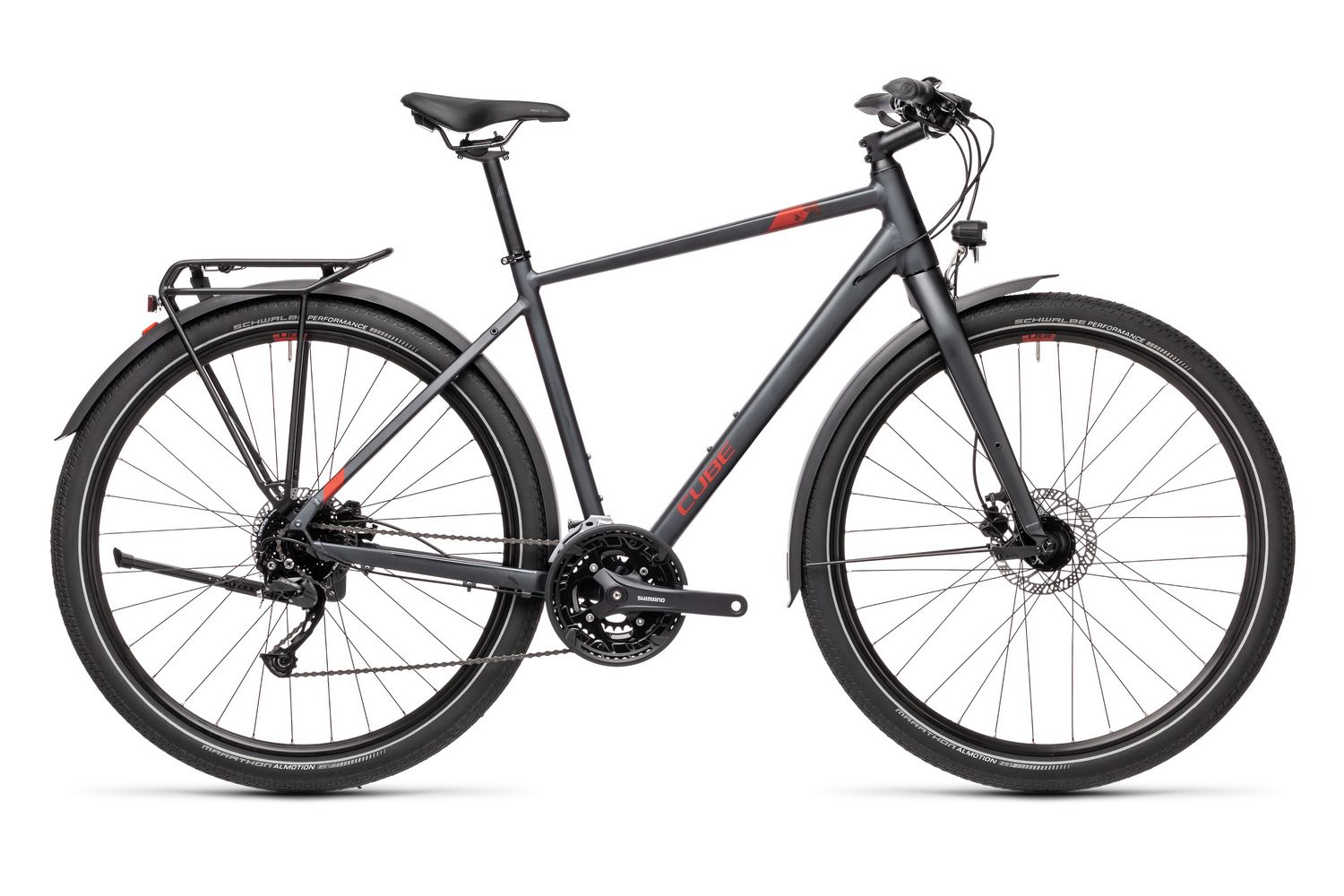 CUBE TRAVEL - дорожный туристический велосипед с жесткой вилкой и большими накатистыми колесами 28 дюймов. Велосипед оснащен оборудованием любительского уровня Shimano Alivio на 27 скоростей, дисковыми гидравлическими тормозами Tektro HD-M275, а также полноразмерными крыльями, багажником, подножкой и системой освещения. Вес 15,3 кг.