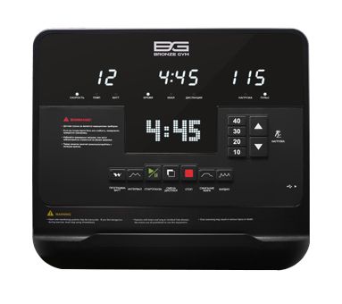 Тренировочный компьютер на Bronze Gym U1200M PRO представлен многофункциональным матричным LED-дисплеем диагональю 15,6 дюймов. Основной экран дополняют 3 небольших буквенно-цифровых LED-дисплея. На мониторах отображаются следующие данные: время, скорость, дистанция, уровень нагрузки, расход калорий, пульс, темп, Ватт. Все клавиши и дисплеи оснащены белой подсветкой, а надписи русифицированы. В число тренировочных режимов входит кардиотренировка, интервальная программа, Ватт-программа и программа сжигания жира. Помимо предустановленных программ, можно воспользоваться самостоятельно регулируемым ручным режимом.