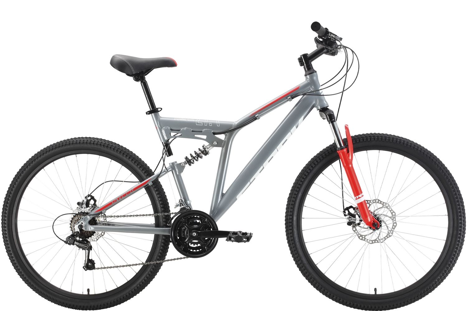 Stark Jumper 27.1 FS D - велосипед на базе алюминиевой рамы, оборудованный амортизацией переднего и заднего колеса, что дает дополнительный комфорт при езде по бездорожью. Дисковые механические обеспечат отличный контроль и торможение в любых условиях. 21-скоростная трансмиссия позволит легко преодолевать подъемы и комфортно чувствоваться себя на спусках и ровных отрезках маршрута. Вес велосипеда 17,3 кг.