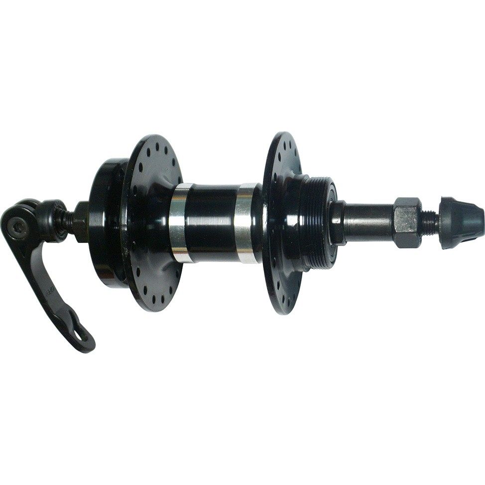 Втулка QS-411R MTB задняя алюминиевая под трещотку, 3/8x14Gx36Hx135x145 на промподшипниках, с эксцентриком, предназначена для дискового тормоза (6 болтов). Она имеет 36 спиц и использует промышленные закрытые подшипники. Крепление звезд осуществляется с помощью трещетки (резьбовое), а втулка фиксируется с помощью эксцентрика. Цвет втулки - черный.